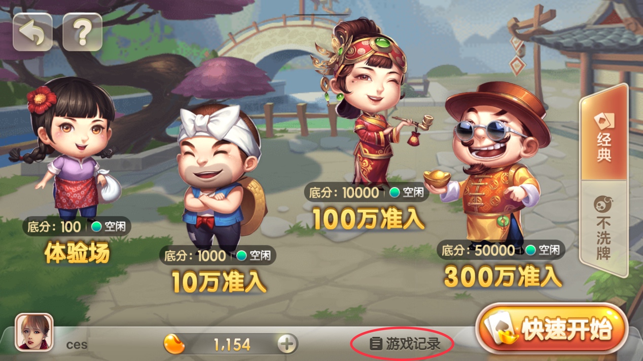 进入728棋牌分类,点击《斗地主》,进入“经典玩法”或“不洗牌”时,都会在右下角看见“游戏记录”图标,点开除了能看到每局的战绩,还可以查看每局的录像进行回顾。
