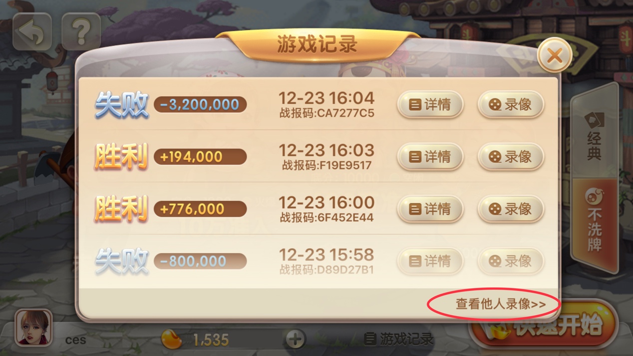 除了可以查看自己的录像,玩家还可以通过输入战报码查看他人的录像。随时随地可以找到大神的对决录像仔细学习,不断提升牌技。